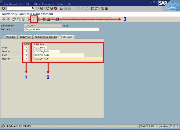 3. Activate:Presionar el botón Activate ( ), de este modo el elemento de datos a crear quedará en estado Activo en el diccionario de datos de SAP.