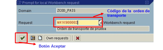 En el cuadro señalado va el código de la orden de transporte en la que quedará almacenado el objeto. Este código se genera en forma automática. Luego se presiona el botón Aceptar.